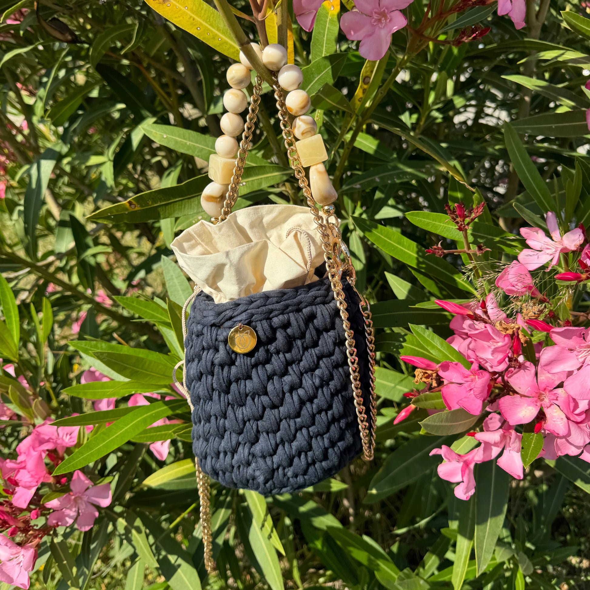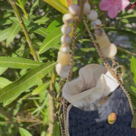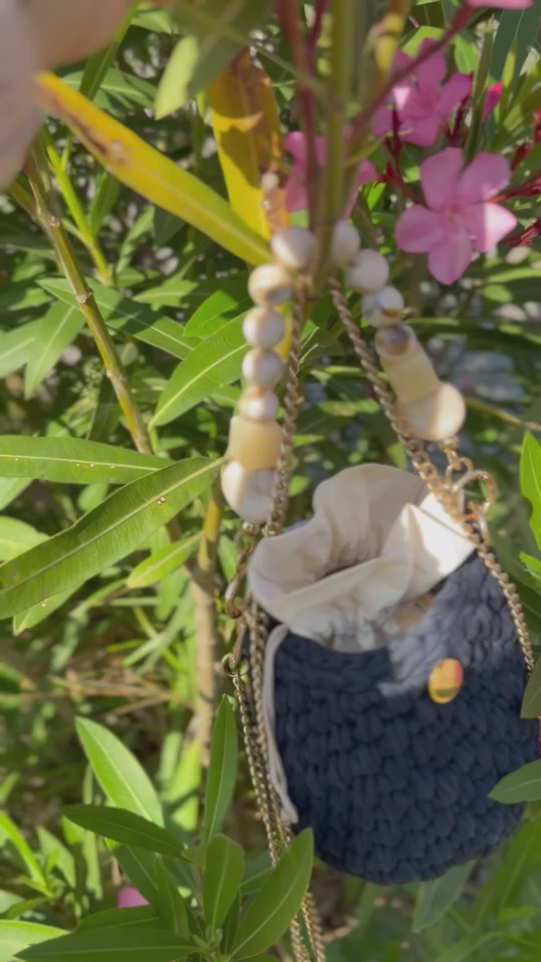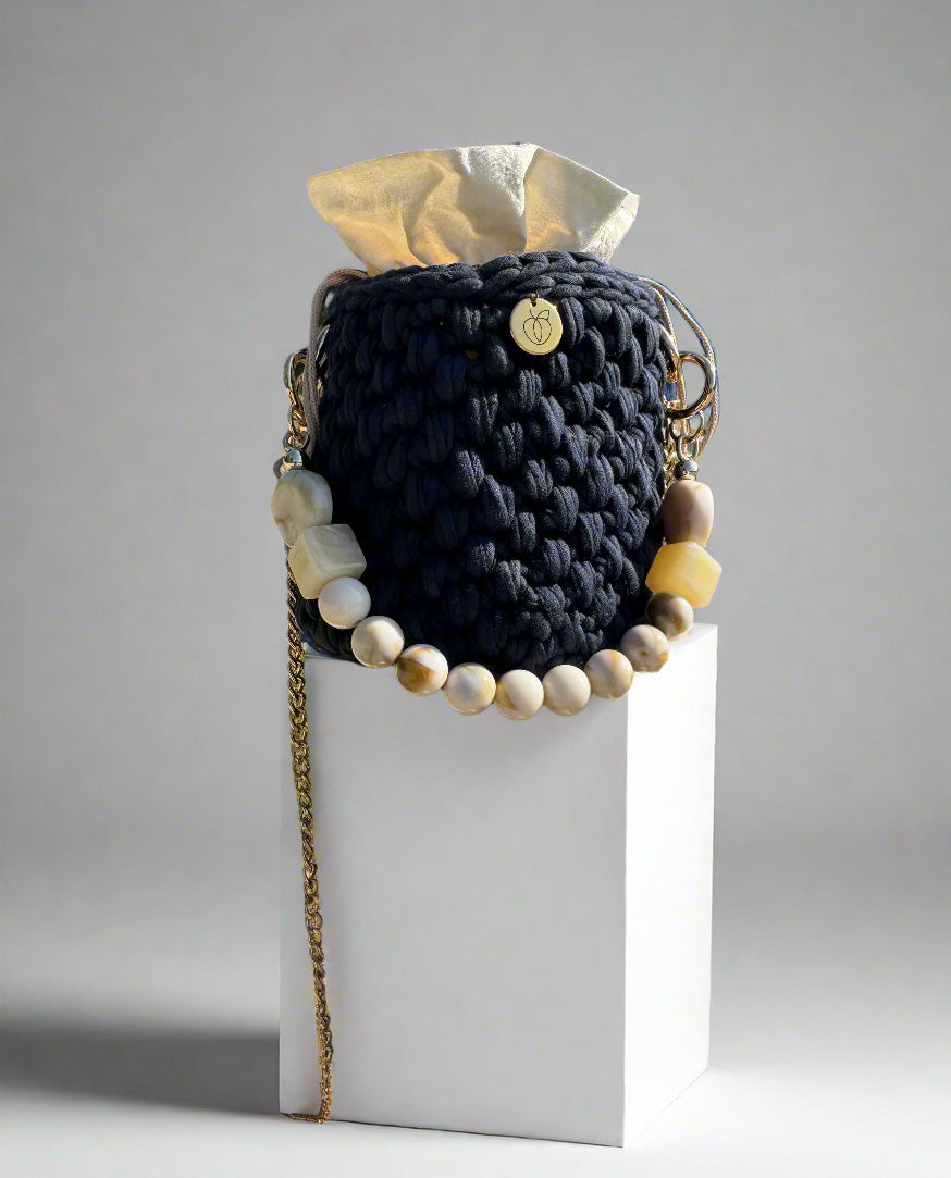 A standout handcrafted handbag made with bold, vibrant yarn and a unique round shape. The Kodessa Bag in blue combines elegance and playfulness, featuring a handle with colorful stones and a gold chain strap for added versatility.