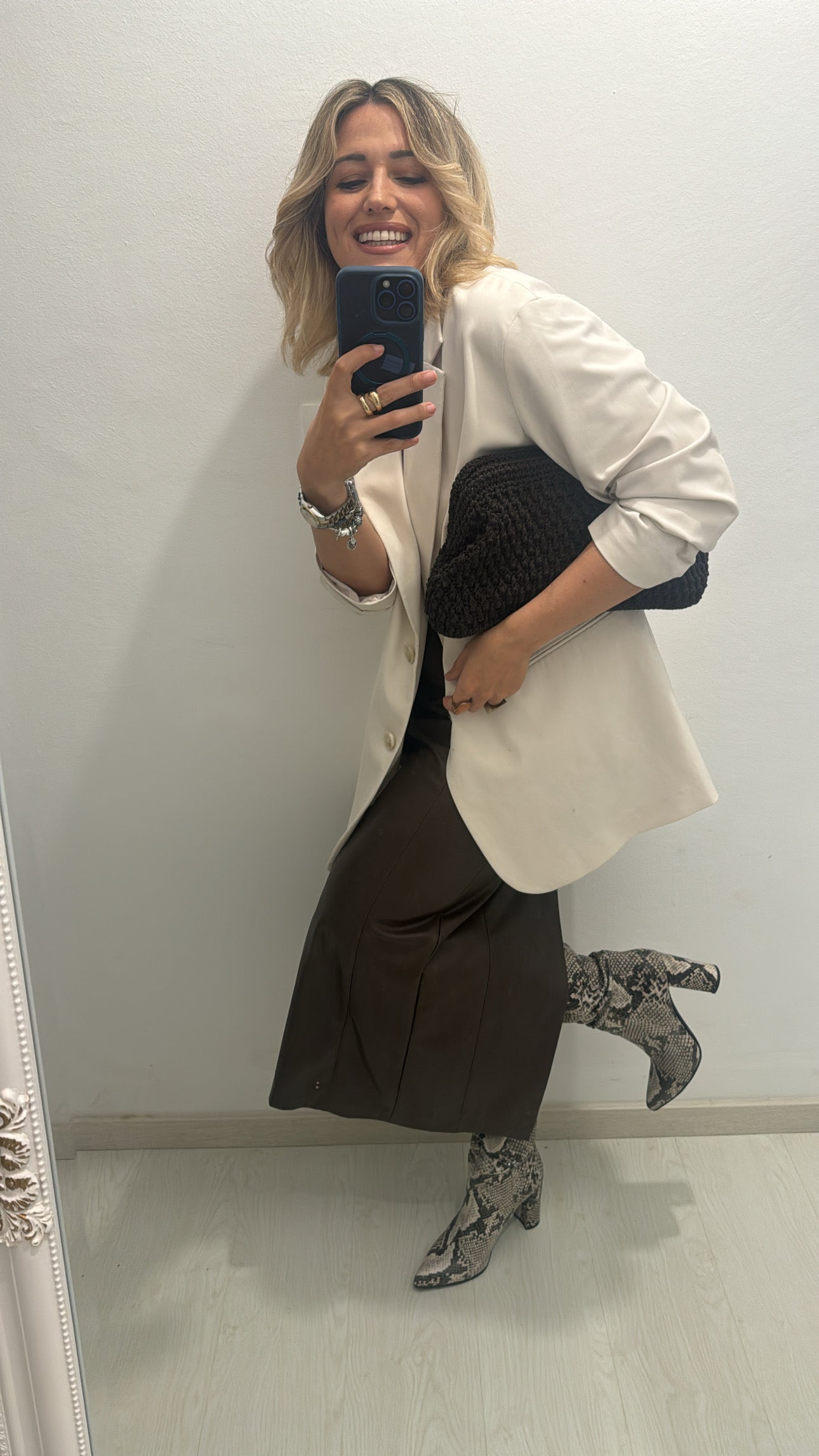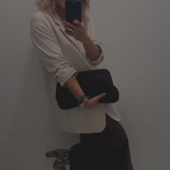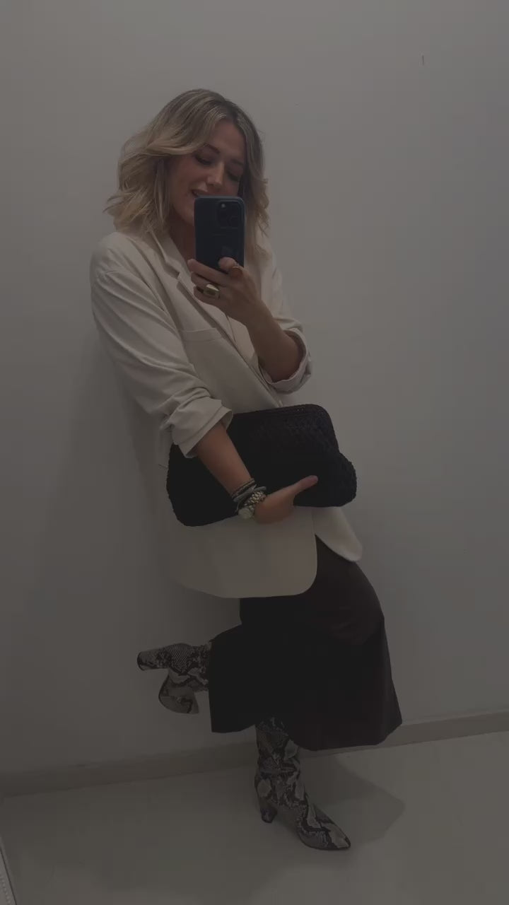 A sophisticated and warm-toned clutch handcrafted with Afroditi yarn, offering a soft texture and timeless appeal. Features a wide metallic clutch frame that adds structure and elegance, making it the perfect accessory for both day and night looks.