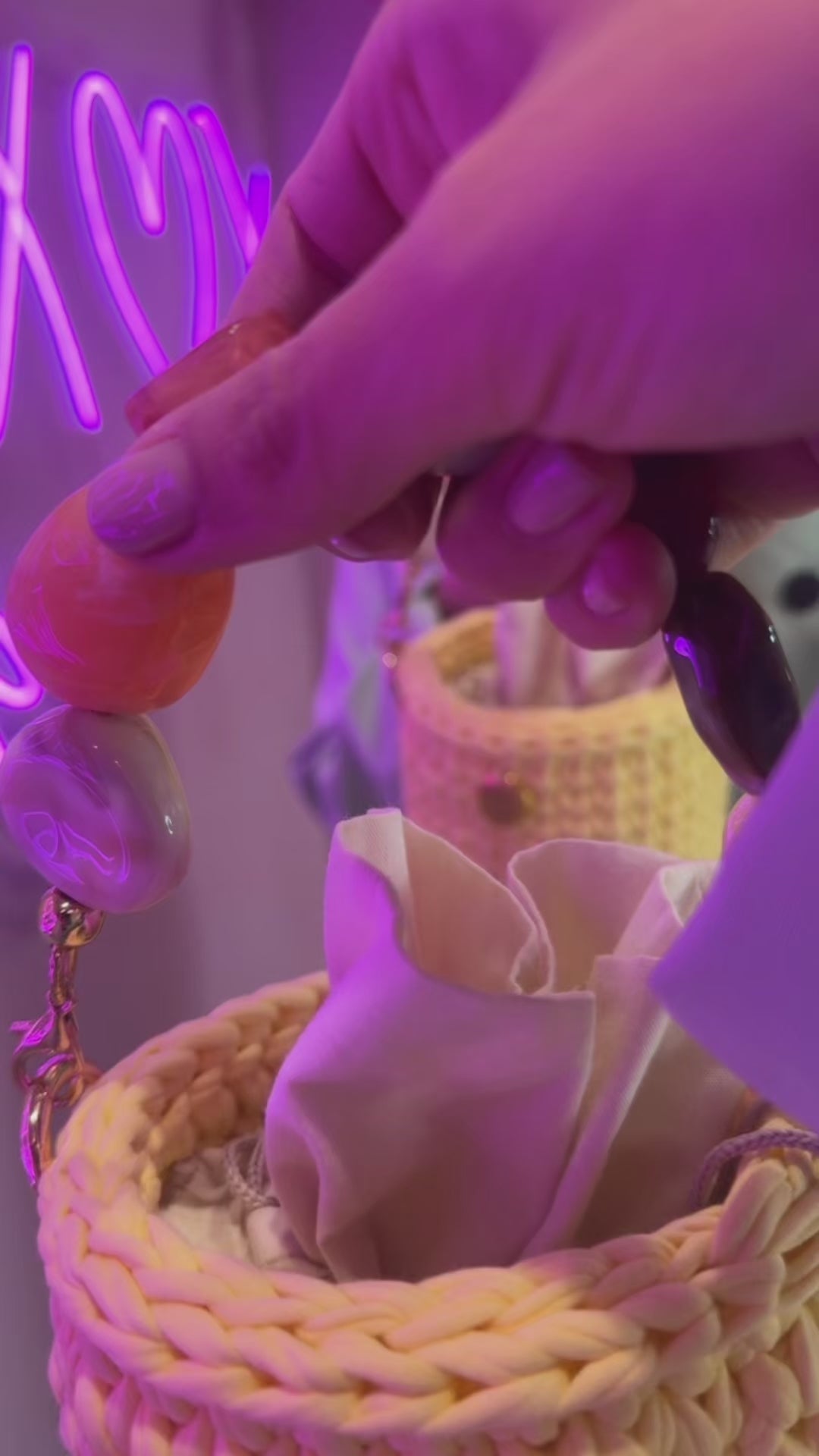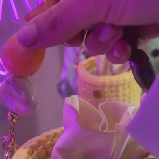 The Kodessa Bag is a handmade oval-shaped bag crafted with recycled cotton yarn. It features a sturdy wooden base and a fabric-lined interior for added durability. This sunny yellow version stands out with a handle adorned with colorful semi-precious stones and a detachable gold-tone chain for crossbody wear.